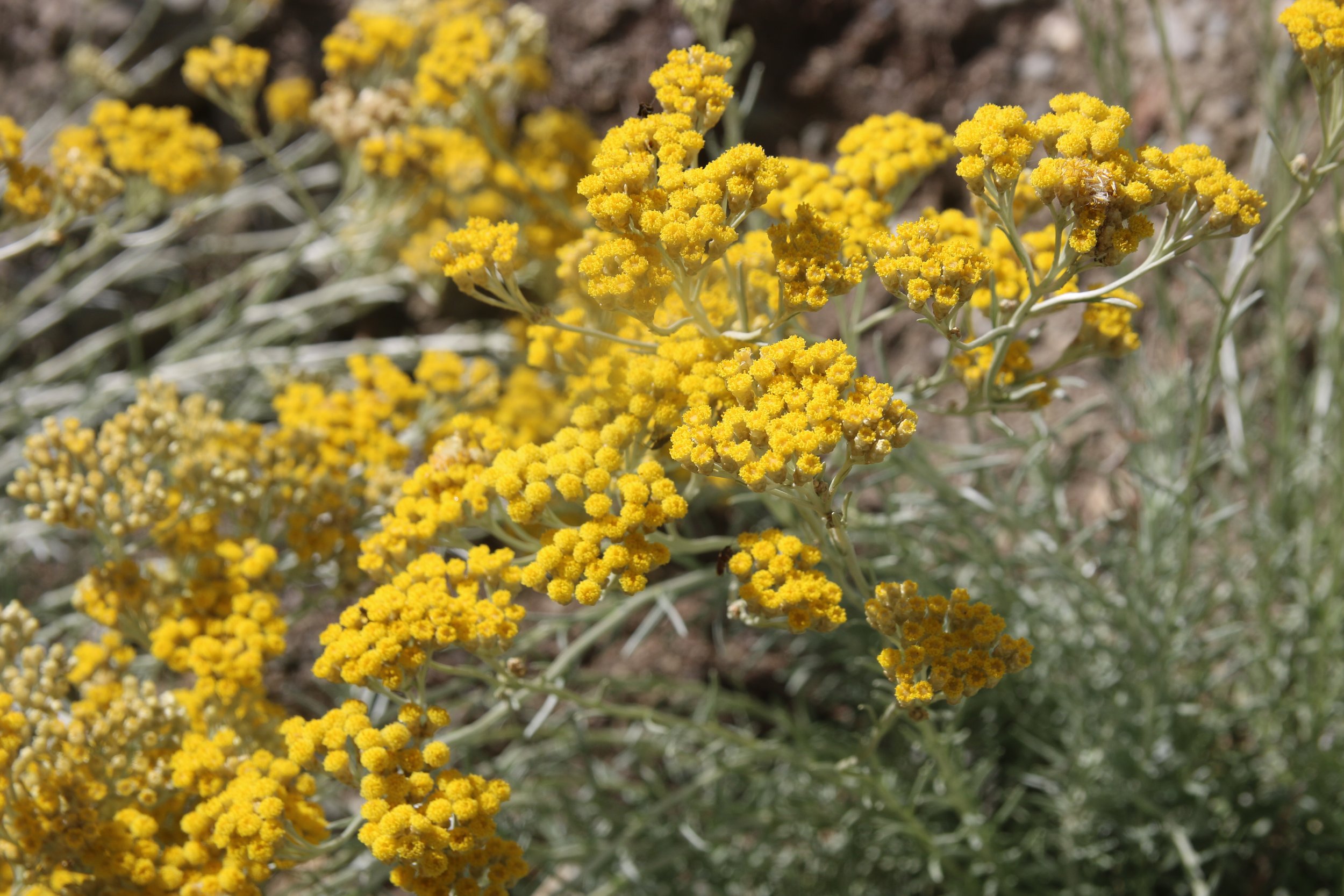 There are more than 600 species in the Helichrysum genus. It is a perennial herb and member of the daisy family. Native to Italy and the Balkan coastal regions of the Adriatic, it made its way to the island of Corsica where it grows wild, often growing on rocky coastal ledges. It reaches more than 60 centimetres (24 in) or more in height and has narrow downy silver white leaves. A hardy shrub, it can grow in most soils and under very harsh conditions, provided there is abundant sunshine.